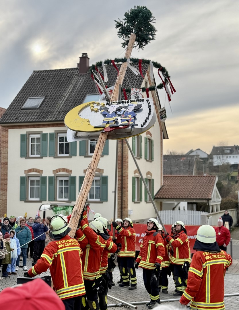 Knackig kühl, aber wunderbar heiter, so präsentierte sich der Himmel über der Perle des Kraichgauer Hügellandes am vergangenen Samstag. Das Wössinger Klima zeigte sich in einer passablen Frühform und lieferte einmal mehr optimale Rahmenbedingungen für das große Narrenbaumstellen der Wössinger Mondspritzer. Die mittlerweile fünfte Auflage des erfrischenden Kult-Events läutet in Wössingen die heiße Phase des Faschings ein und steht für einen bunten und närrischen Nachmittag für die ganze Familie. Los ging es etwas früher als 14:11Uhr (wir konnten es einfach kaum erwarten, dass der Stängel endlich in den Himmel ragt). Auf dem Vorplatz des Walzbachtaler Regierungssitzes traf ein närrischer Mob (Mondspritzer, Kreitzkepf, Loddler, eine Delegation aus Bretten, die Good Weibz und diverse andere) mit Baum im Gepäck auf eine Schar feierwilliger und baumaffiner Jecken. Nachdem Sitzungspräsident Karsten Matt Gäste und Publikum begrüßt hatte, durften die Gardemädels ihre Beine gekonnt durch die Luft schwingen. Nun war es endlich soweit und an der örtlichen Feuerwehr den Narrenbaum in Position zu wuchten. Das ließen sich die semi-professionellen Brandbekämpfer unter den Augen von Bürgermeister Timur Özcan natürlich nicht zweimal sagen und in Nullkommanix stand das Teil und thront nun stolz auf dem Rathausplatz. Dies wusste das Gemeindeoberhaupt rhetorisch stilvoll zu kommentieren, bevor Karsten Matt die närrischen Gäste aus Bretten und Jöhlingen begrüßte. Ein weiteres Highlight waren Sanjas „Good Weibz“ die den Town-Hall-Square zum Dancefloor verwandelten. Im Anschluss packte der „Wössinger Bu“ Wolle Becker die Gitarre aus und sorgte für Stimmung. Bevor die Loddler nochmal final den Ortskern beschallten, sang der ganze Platz zum Abschluss des offiziellen Teils zusammen das Walzbachtälchen (immer wieder ein Gänsehautmoment). Da die Mondspritzer ordentlich Glühwein (der so manches Herz erwärmte), Bier, Kuchen und leckere Heiße mit Weggle parat hielten, setzte sich das bunte Treiben bis in den späten Nachmittag fort und erst mit Beginn der Dämmerung ging ein tolles Event, dass mittlerweile nicht mehr aus dem Wössinger Kulturkalender wegzudenken ist, entspannt zu Ende.