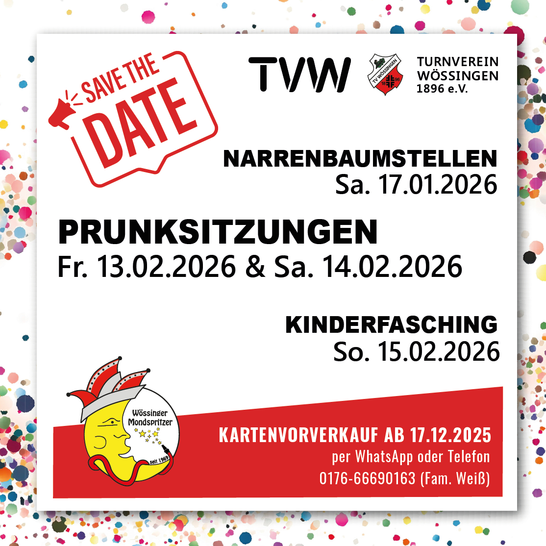 On top könnt ihr Karten für die großen Prunksitzungen des TVW kaufen (Vorverkauf seit 17.12.2025 per WhatsApp oder telefonisch bei Familie Weiß unter 0176-66690163 möglich). Also nix wie rein in eure Kostüme und ab auf den Rathausplatz! Weil wir ein geiler Haufen sind und euch das Rundum-Sorglos-Paket bieten wollen gibt’s hier nochmal alle Termine auf einen Blick: