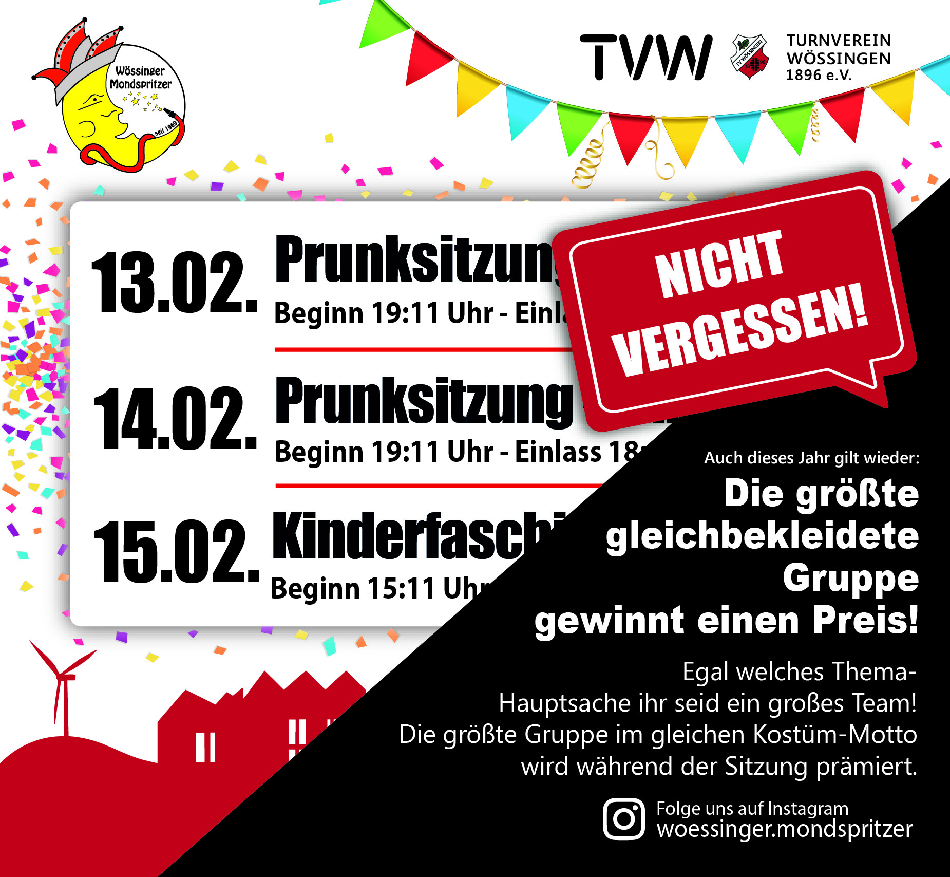 On top könnt ihr Karten für die großen Prunksitzungen des TVW kaufen (Vorverkauf seit 17.12.2025 per WhatsApp oder telefonisch bei Familie Weiß unter 0176-66690163 möglich). Also nix wie rein in eure Kostüme und ab auf den Rathausplatz! Weil wir ein geiler Haufen sind und euch das Rundum-Sorglos-Paket bieten wollen gibt’s hier nochmal alle Termine auf einen Blick: