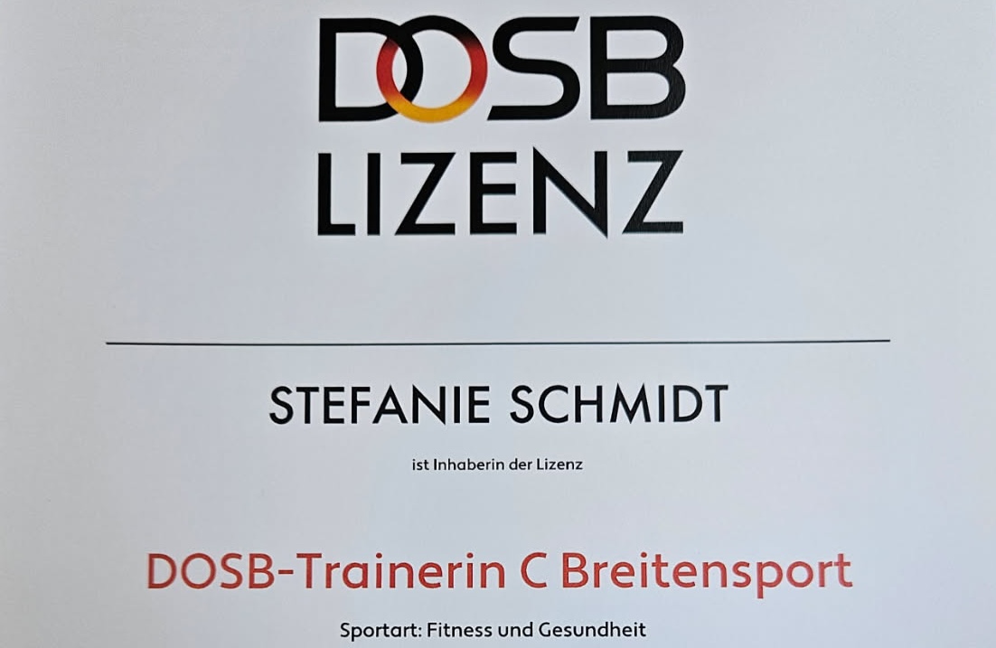 Stefanie Schmidt schloss vergangene Woche mit dem Prüfungslehrgang auf der Sportschule Schöneck den letzten Bestandteil ihrer Ausbildung zur DOSB Trainerin C Breitensport – Fitness und Gesundheit – ab.